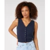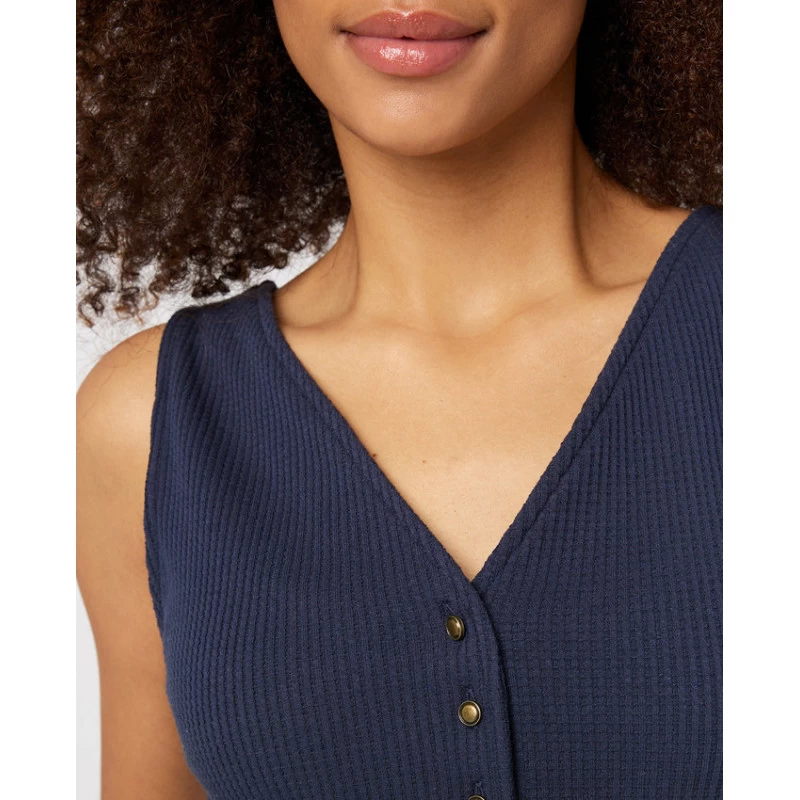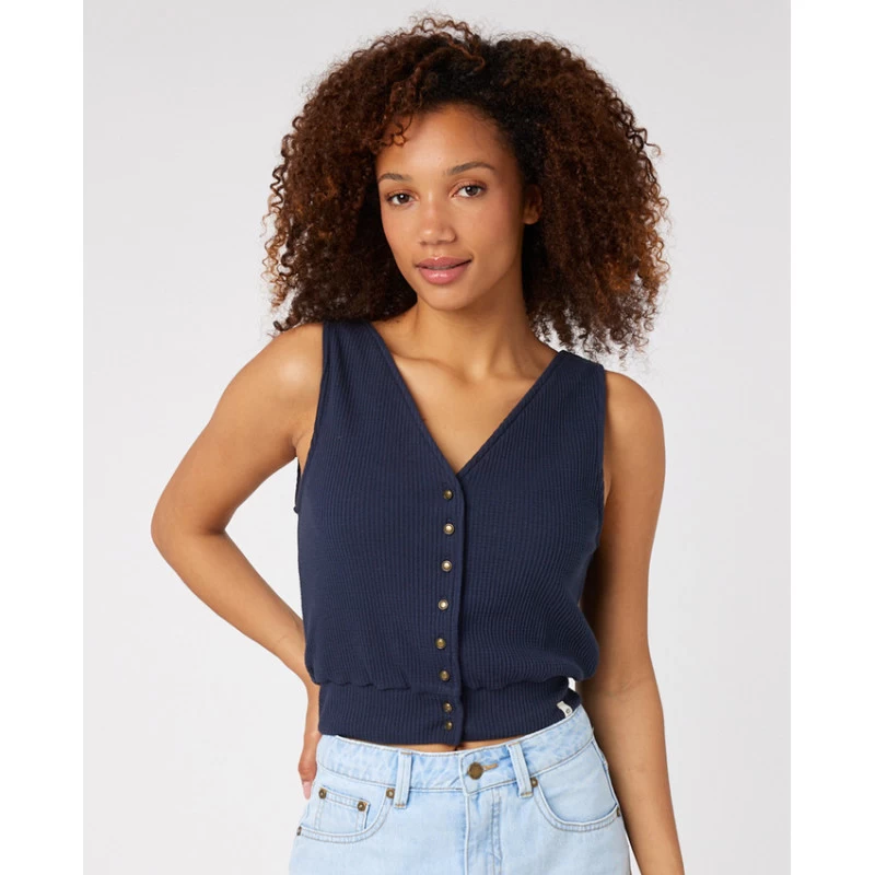 Ce joli top sans manches est en mélande de conton et polyester. Il a un col en V et se ferme sur le devant avec de jolis boutons. Disponible en bleu marine et blanc.