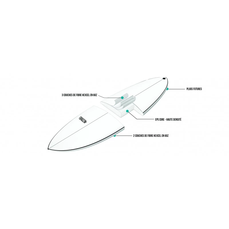 Cette planche est proposée avec 3 boîtiers Futures, c’est le meilleur montage pour une bonne maniabilité et commencer à faire de belles courbes.